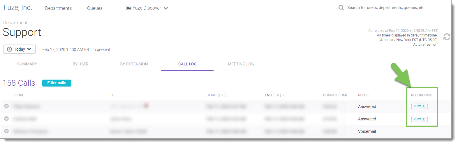 - If a call recording exists for a call, a VIEW button appears under the RECORDINGS column.