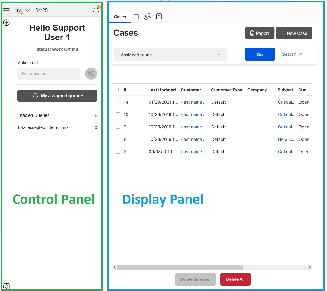 - Control Panel: Provides controls to process interactions in your contact center and to manage agent status.