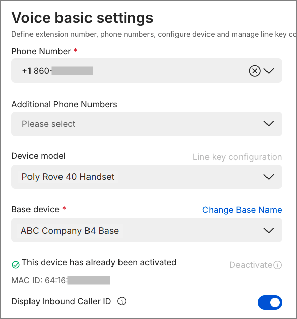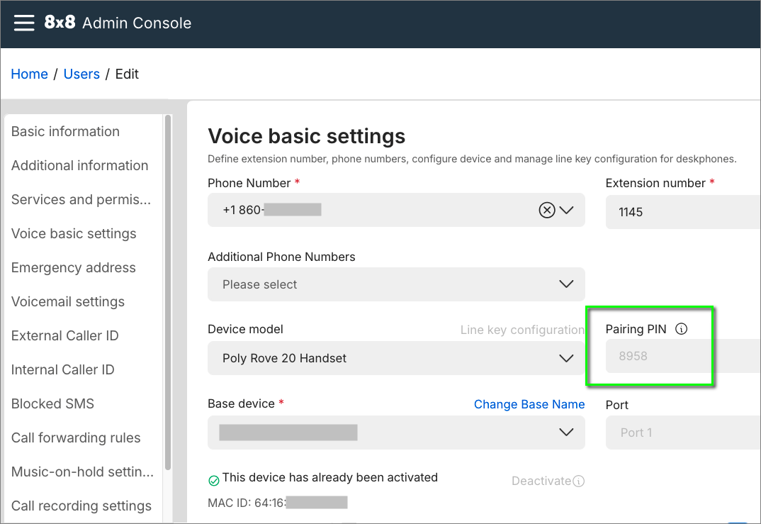 - If the base has already been provisioned with 8x8, the Pairing PIN can be found in the 8x8 Admin Console in the user’s Voice basic settings section.