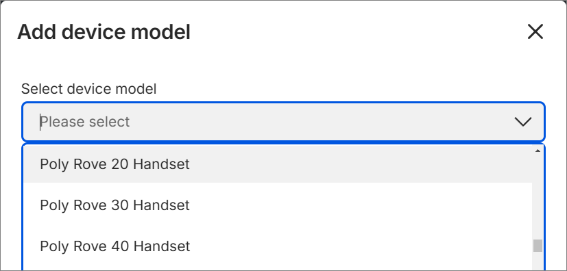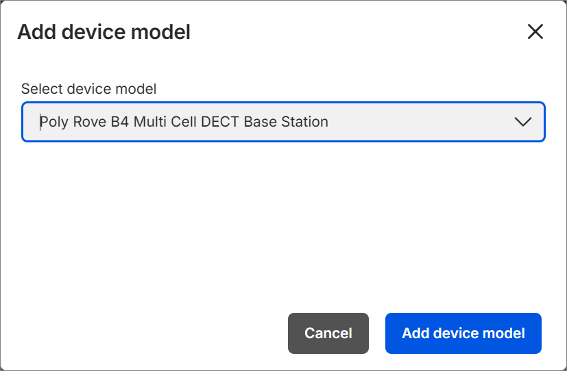 - In the Add device model drop-down menu, select Poly Rove B4 Multi Cell DECT Base Station, then click Add device model.