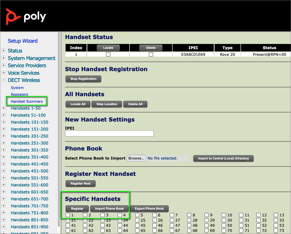 - In the web interface, navigate to DECT Wireless > Handset Summary.