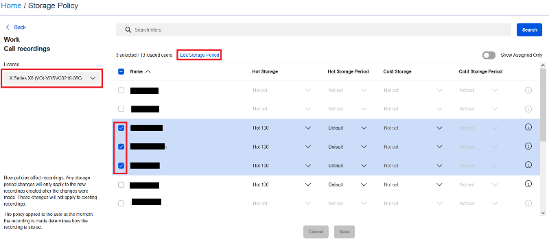 The policy assigned to the user at the time the recording is made determines how the recording will be stored. Changes made to a user’s policy will take effect on the user’s next recording after the changes are made. After cold storage is assigned, it will begin on the next call after the new policy is applied. Any calls previously will not be included in the cold storage, just calls moving forward. |