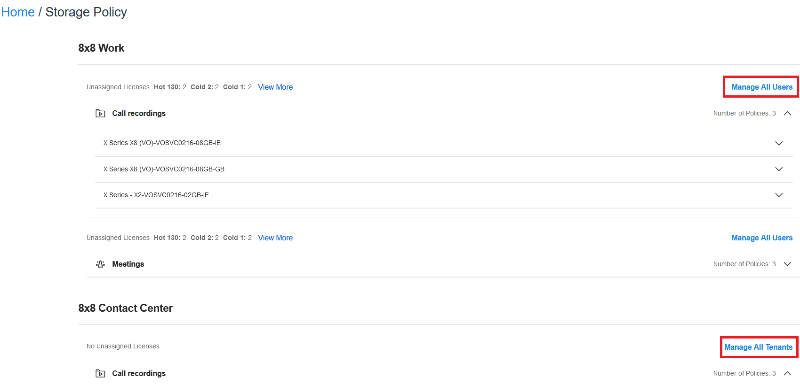 - Locate the storage policy row you want to edit, click Manage All Users (for 8x8 Work) or Manage All Tenants (for 8x8 Contact Center).