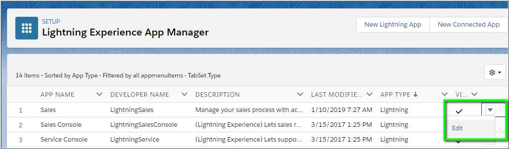 - Click the drop-down arrow in the row of the Lightning app you're adding the 8x8 integration to, and select Edit.