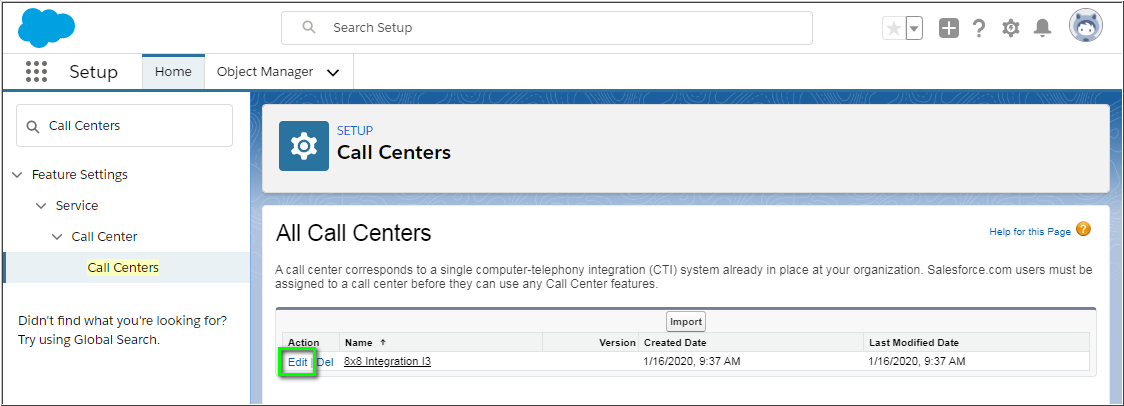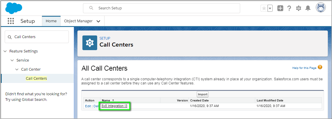 - Click on the name of the 8x8 Integration I3 call center (do not click Edit).
