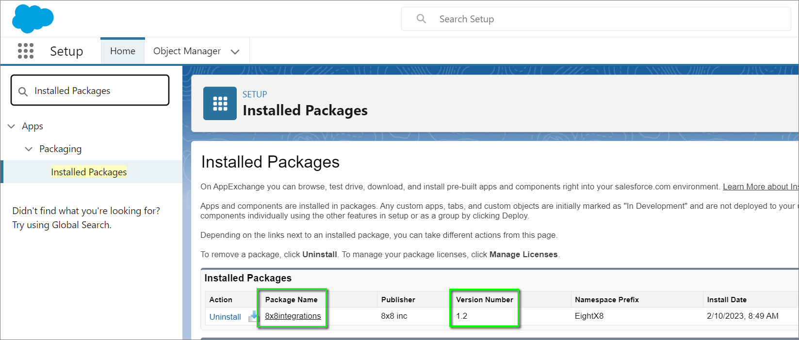 - Verify that package 8x8integrations is installed, and proceed to the next step.